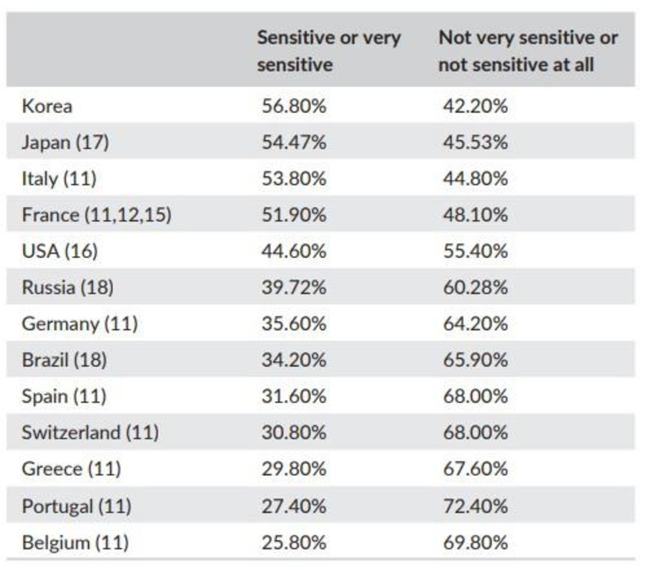 한국인이 자기 스스로 민감성으로 평가하는 비율은 비교 대상 12개국에 견줘 가장 높았다.