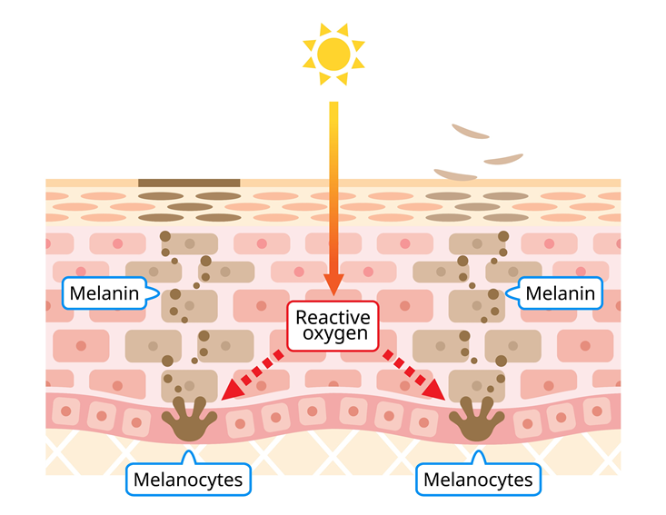 자외선, 호르몬, 스트레스, 장벽 손상 등 여러가지 원인에 의해 피부를 보호하기 위해 멜라노사이트에서 멜라닌 색소를 분비