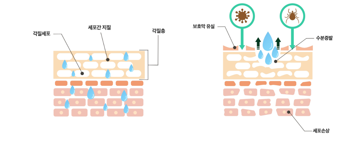 각질층의 피부장벽이 손상되어 보습 장벽, 보호 방어벽이 무너져 각질층에 틈(crack)이 생겨